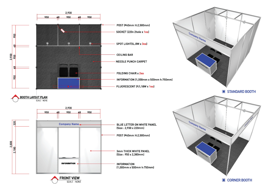 • 1 booth size is 3mx3m (total 9m2).